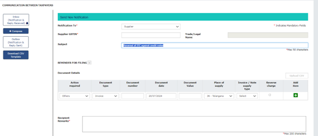 GST portal has already enabled the feature of communication between taxpayer (refer above screenshot), which can be used for getting confirmation from recipients for reversal of ITC against credit notes issued by the supplier.  While composing the communication, GST portal can fetch the credit notes issued by the supplier in the document details and it can be sent to recipients for confirmation. This will be easier than obtaining separate CA/CMA certificates/Declarations from recipients.